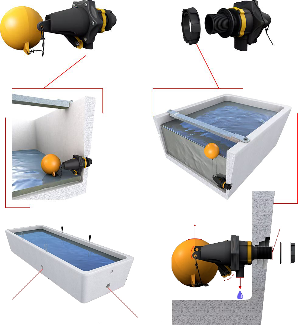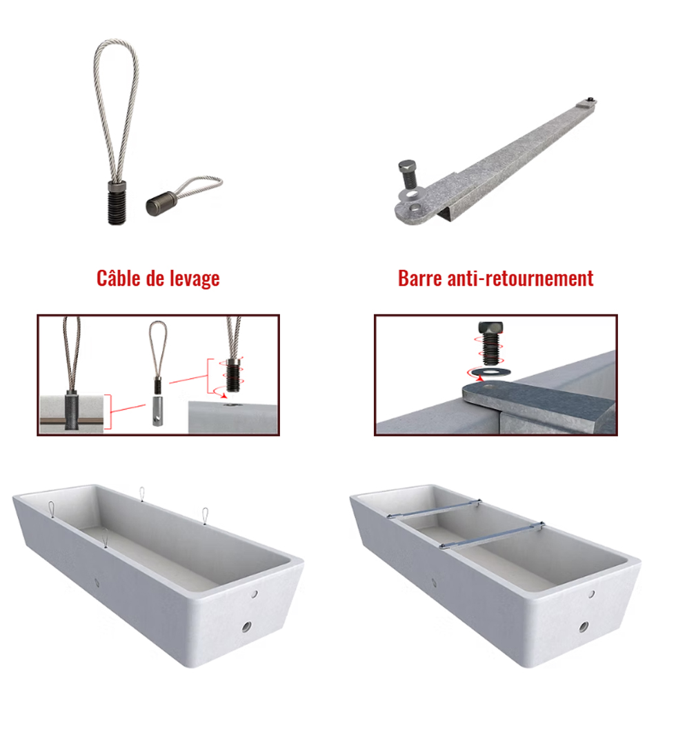 Pour la sécurité des animaux, il existe des barres anti-retournement spécialement conçues pour éviter une chute accidentelle, ainsi que des élingues de levage pour la manutention du produit. Deux points d'ancrage et de fixation de barre pour le bac 3mx1m, et trois pour le bac de 3.5x1.2m. |