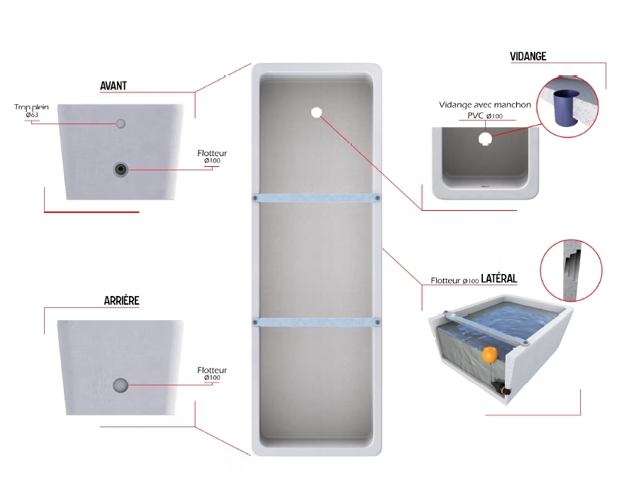 1000 Litres (avec bouchon de vidange PVC diamètre 100) - Dimensions 3 m x 1 m x 0.55 m (Lxlxh)