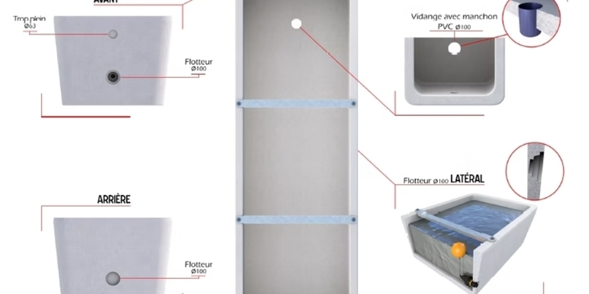 550 Litres (avec bouchon de vidange PVC diamètre 100) - Dimensions 3 m x 0.65 m x 0.50 m